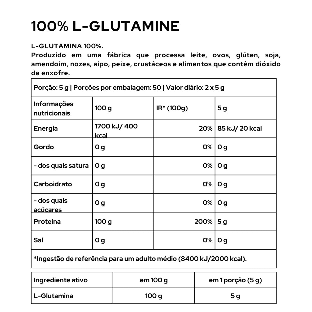 L-glutamina em pó 100% pura, sem sabor e sem glúten.