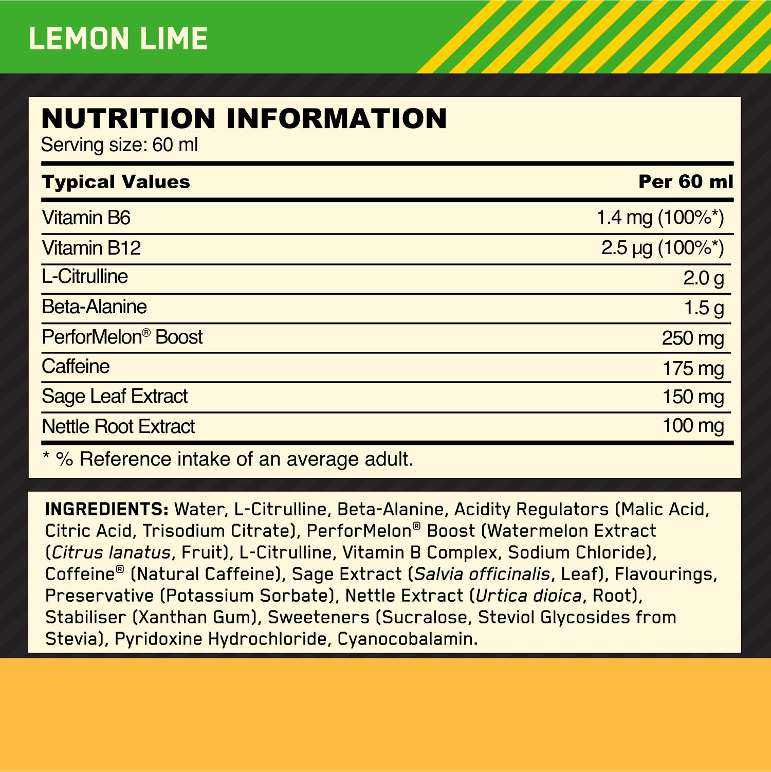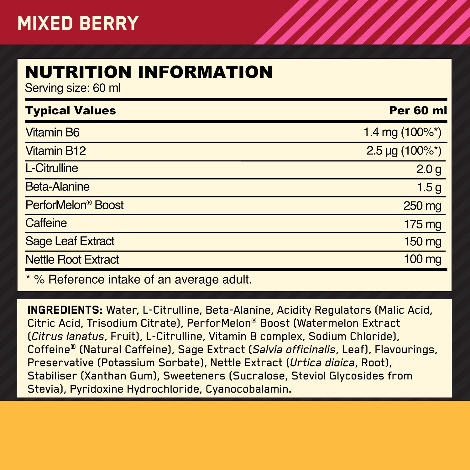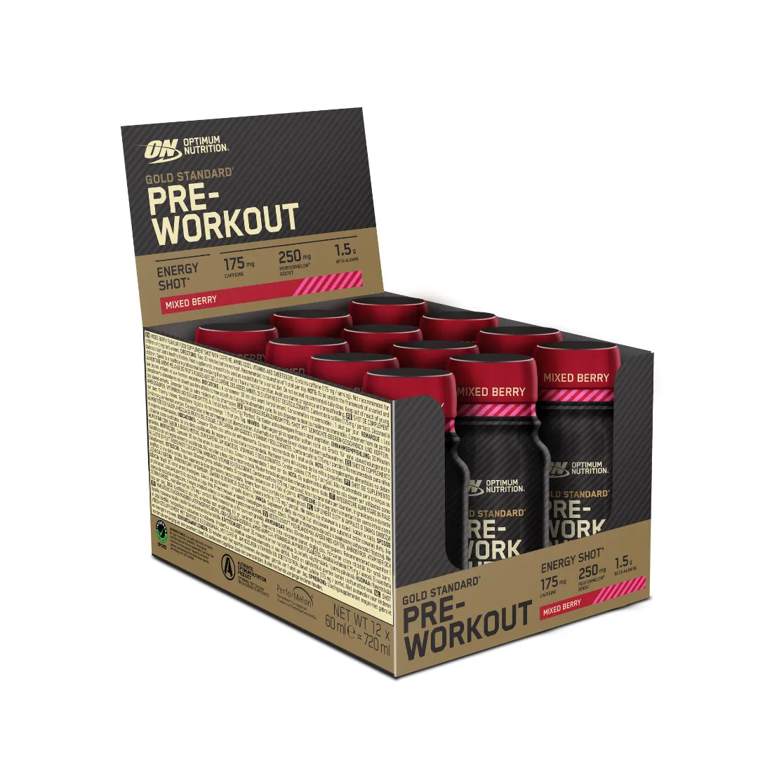Gold Standard Pre-workout Shot da marca de nutrição desportiva número 1 do mundo, Optimum Nutrition. O Gold Standard Pre-workout Shot aumentará seu foco graças a 175 mg de cafeína por porção de fontes naturais, juntamente com 1,5 g de beta alanina e vitamina B6 e B12 para apoiar o metabolismo energético. Além disso, também inclui o novo ingrediente PerformMelon Boost para ajudar você a aproveitar ao máximo seu treino. Disponível em sabores excelentes e saborosos.