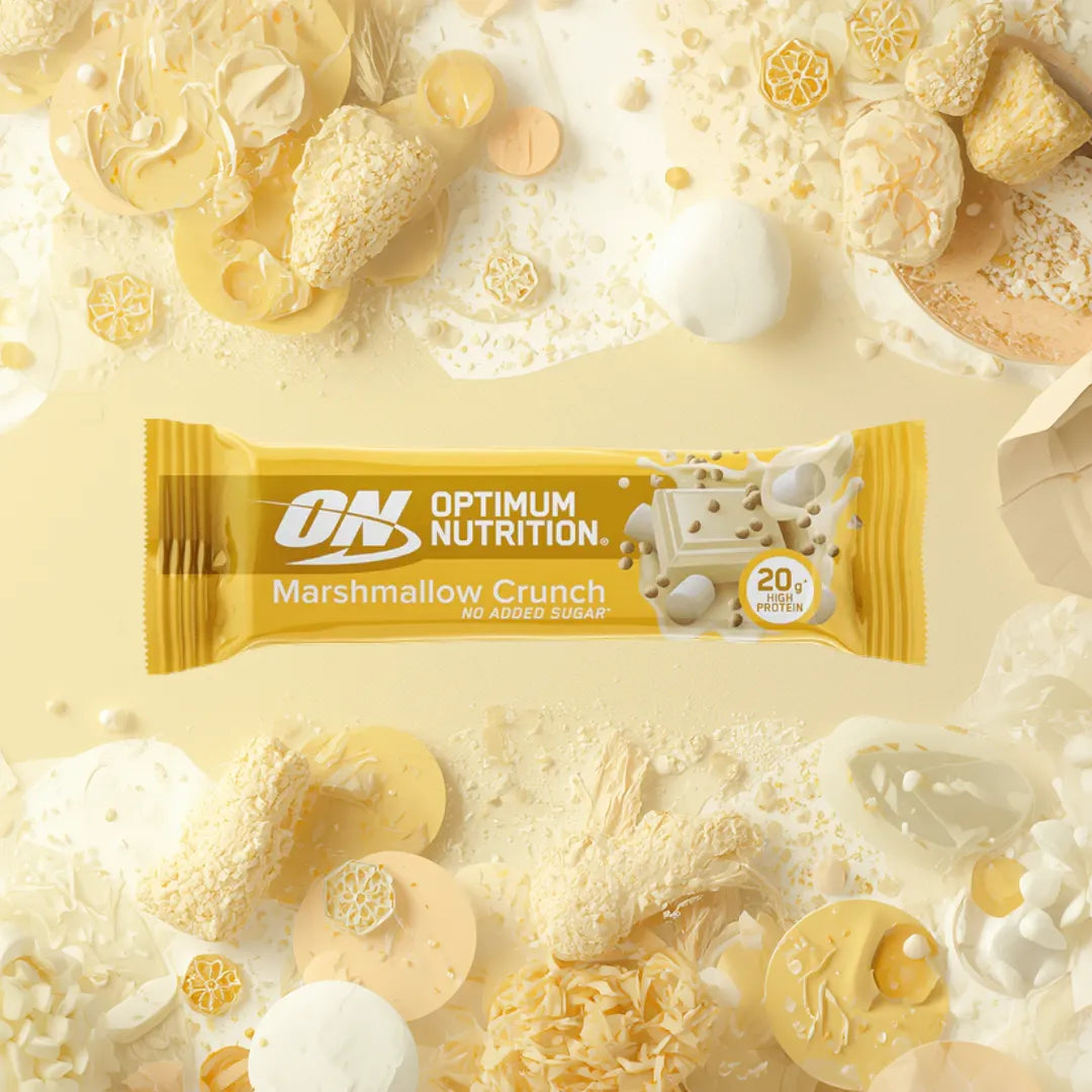 Recarregue as energias com a barra de proteína Marshmallow Crunch da Optimum Nutrition.