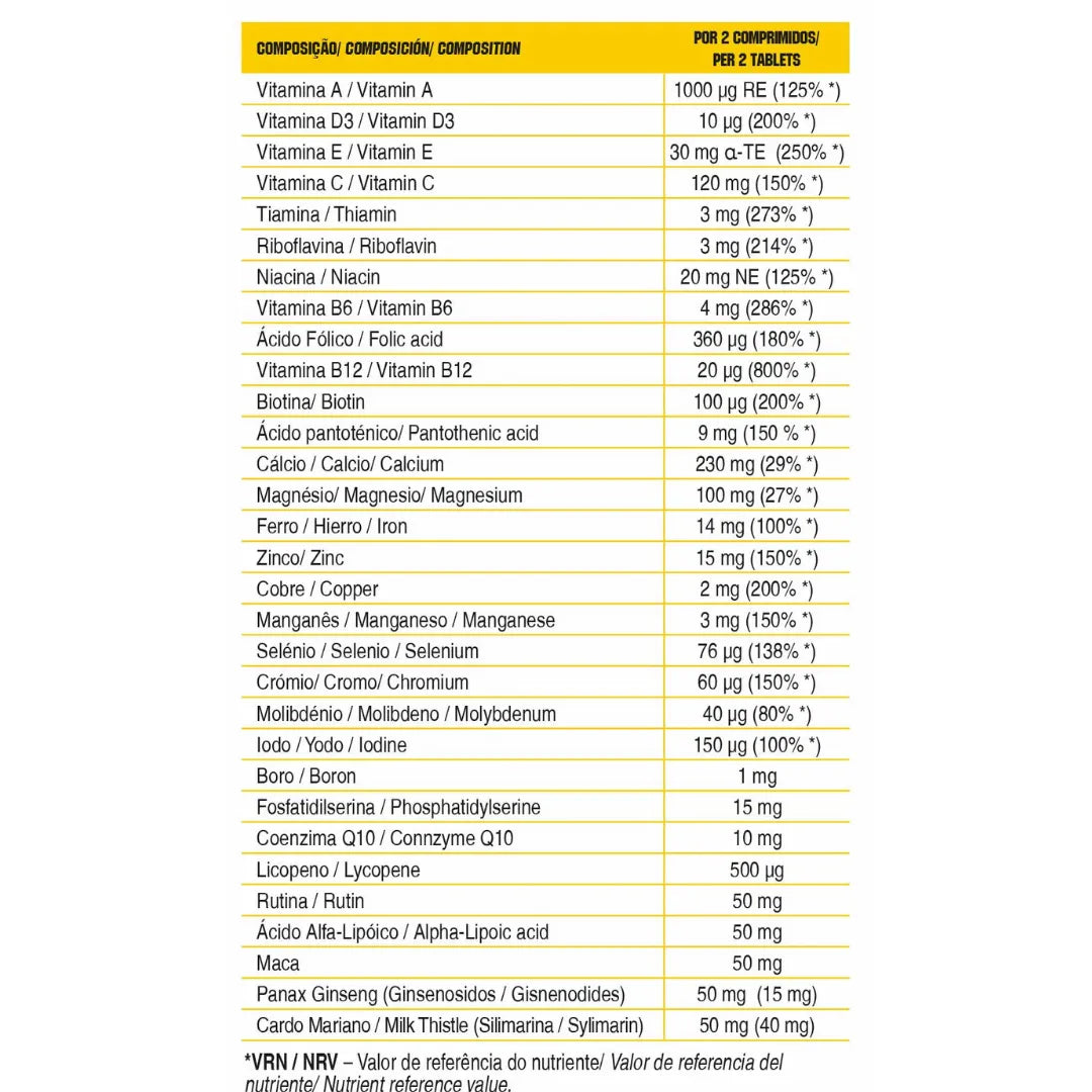 Multivitamin contém a base nutricional completa para a vitalidade diária. Uma fórmula avançada de vitaminas, minerais e extratos de plantas para reforçar a imunidade, a energia e combater o stress do dia a dia.