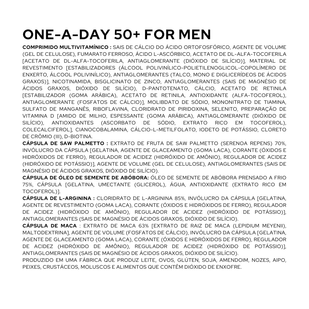 O One-A-Day 50+ For Men contém 30 saquetas e cada uma delas contém 5 tipos de comprimidos e cápsulas:
