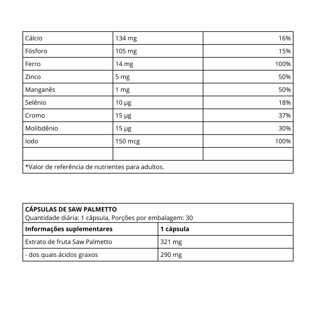 Cápsula de Saw Palmetto: Extrato de fruta de Saw Palmetto (Serenoa repens) 70%, invólucro da cápsula [gelatina, agente de glaceamento (goma laca), corante (óxidos e hidróxidos de ferro), regulador de acidez (hidróxido de amônio), regulador de acidez (hidróxido de potássio)], agente de volume (gel de celulose), antiaglomerantes (sais de magnésio de ácidos graxos, dióxido de silício).