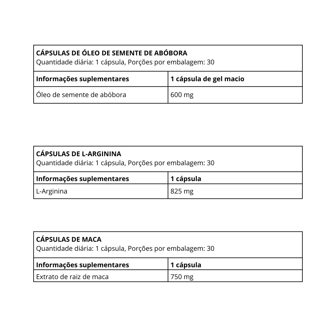 Cápsula de óleo de semente de abóbora: óleo de semente de abóbora prensado a frio 75%, cápsula [gelatina, umectante (glicerol), água, antioxidante (extrato rico em tocoferol)].