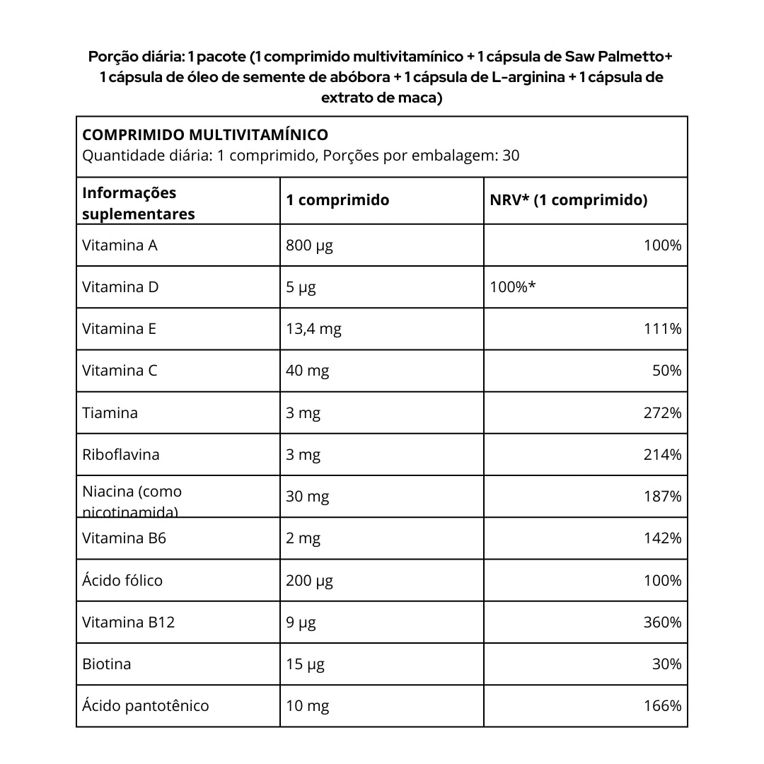 - 1 comprimido multivitamínico com 12 vitaminas e 9 minerais.