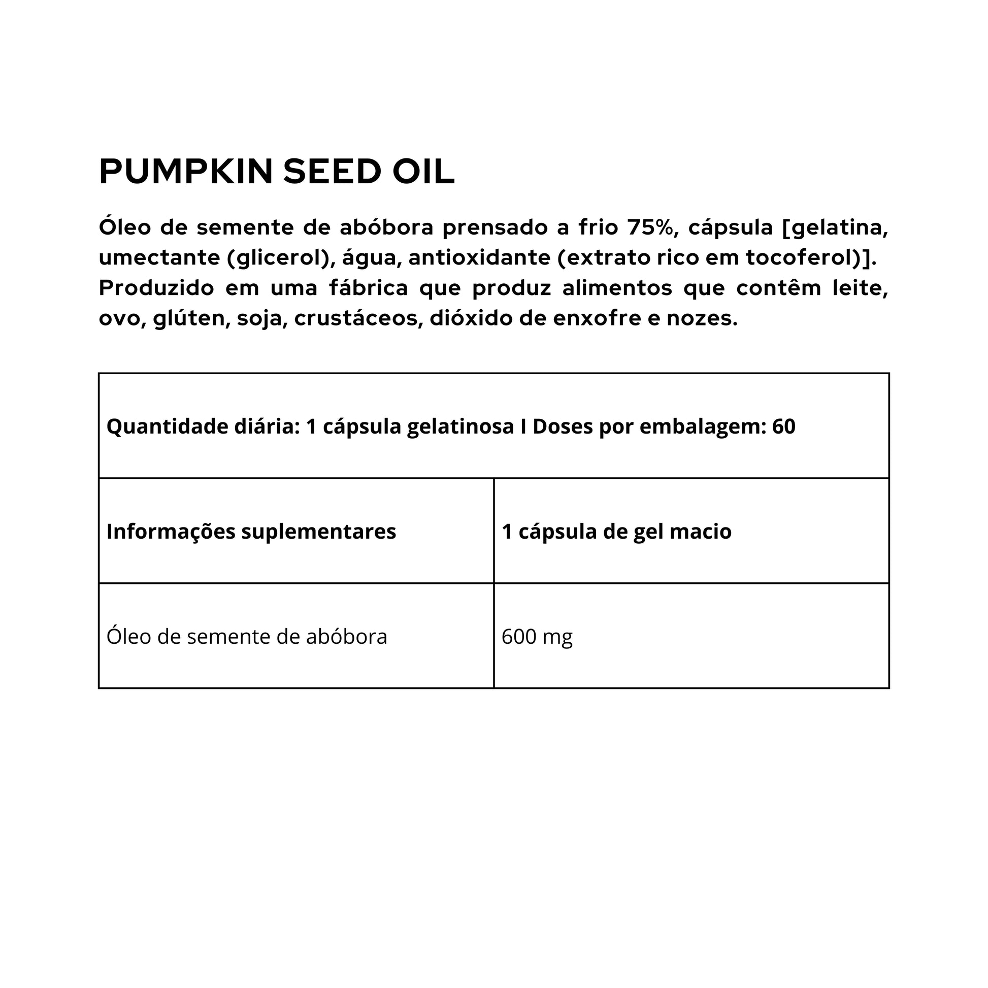 Ingredientes: Óleo de semente de abóbora prensado a frio 75%, cápsula [gelatina, umectante (glicerol), água, antioxidante (extrato rico em tocoferol)].